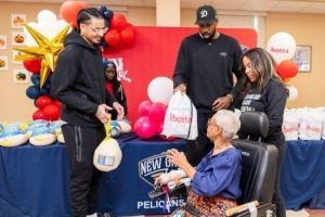 德安德烈·乔丹和米卡·皮维代表球队向新奥尔良社区的居民发放火鸡和感恩节食材,提前预祝球迷节日快乐。