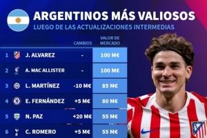 体育资讯10月18日讯 德国转会市场更新了部分球员的身兼,并列出阿根廷球员德转身价排名,阿尔瓦雷斯、麦卡利斯特1亿欧居首。
